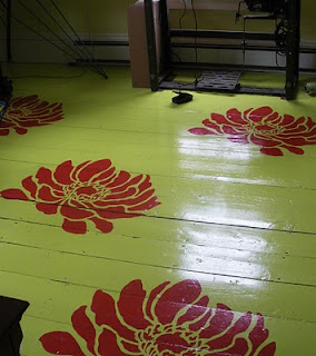 Finally have  a photo of my studio floor.  It turned out a tad more neon than I had anticipated.  I painted these giant stencils on and now I’m a happy camper.  Stencils can be found here.