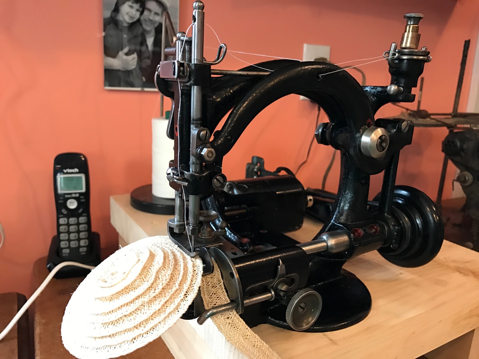 I never did know what the machines were meant for, but a few months ago I came across a photo of a straw braid machine and I realized that this was my machine. So, I called Neil at Bridgewater Sewing and he cleaned it up for me and put on a little motor and I got to work.