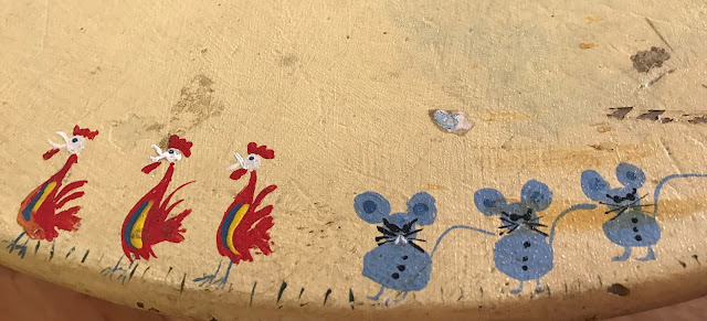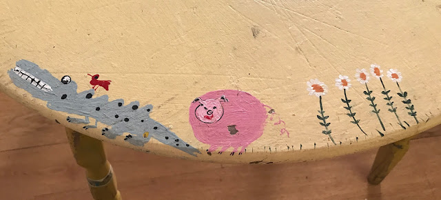 So, about these pictures here. Obviously they are not by Maud Lewis. I painted this little table when I was in my twenties. I painted tons of stuff in my twenties. This is the only thing I still have because I had it in my mind that I would keep this table for my own child. You can see that years later my own child added stickers and I believe a robot doodle.