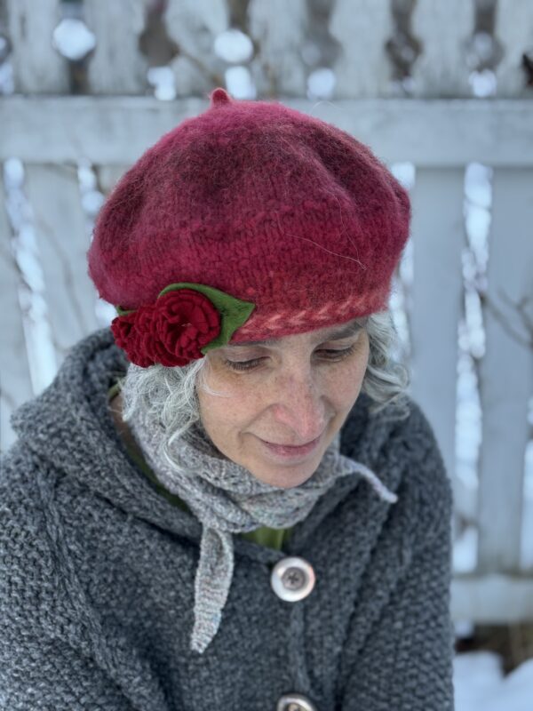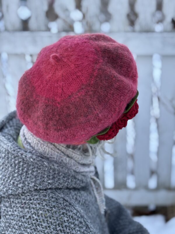 The Collette beret is hand knit and felted from Canadian Dorset wool and adorned with handmade wool felt flowers. The felted fabric creates a warm, water and wind resistant hat. I hand dyed many shades of red and knit them together to make this pretty, variegated red.