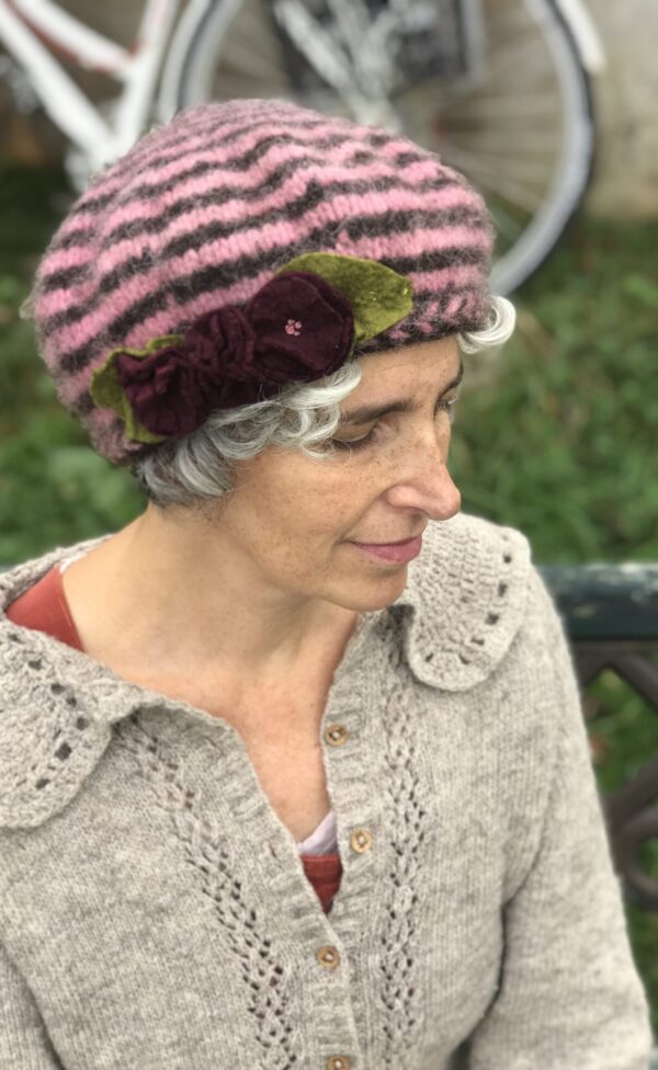 Colette is a hand knit and felted cozy beret made from Canadian Wool. After knitting an oversized beret, I then mercilessly shrink it by hand. The felting creates a very thick, water and wind resistant hat. The flowers are made from wool felt