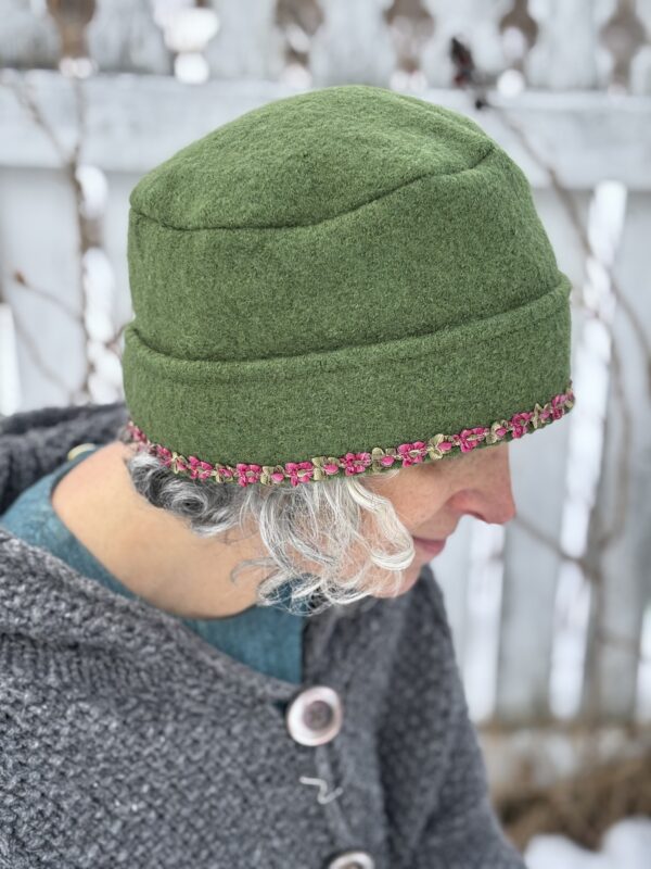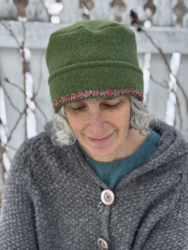 Claire Hat- Green Boiled Wool with Pink Floral Ribbon- Medium/Large- Ready to Ship