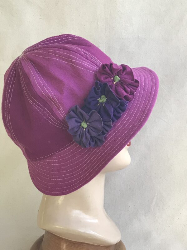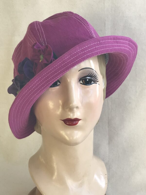 The flowers on the hat are held on with two pin backs, so the flowers can be moved around the hat or you can wear the hat plain and wear the flowers as a brooch. I can make these pansies in many different colours, so please ask if you would like a different colour.
