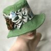 Handcrafted in Lunenburg, Nova Scotia, this pretty green 1940s inspired fedora hat is made from hand-dyed cotton canvas and features a charming floral print, double bow and fabric flowers. Lightweight, stylish, and unique—perfect for adding an artisan touch to any outfit.