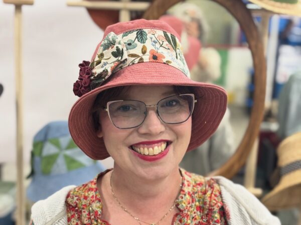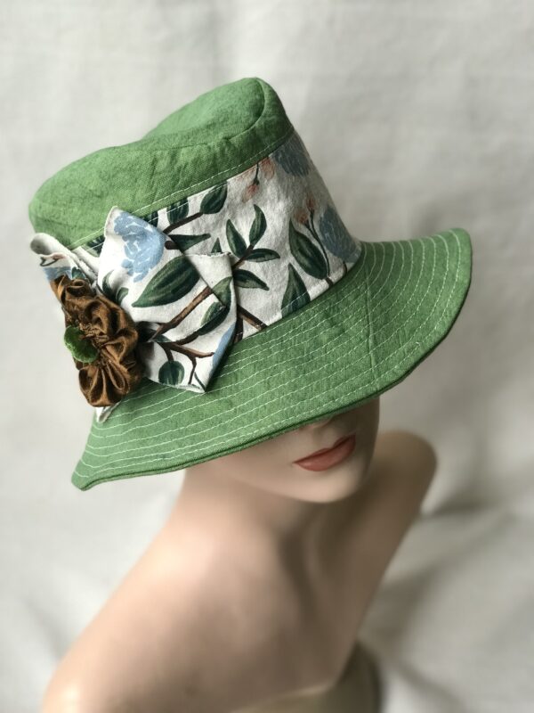 Crafted from hand-dyed cotton canvas, this hat exudes 1940s men’s wear inspired elegance. A beautifully detailed fabric band featuring a delicate botanical print enhances its timeless appeal, while a handcrafted double bow and fabric flowers add a unique, feminine touch. The structured yet soft brim provides both style and sun protection, making it a versatile accessory for Spring, Summer or Fall.