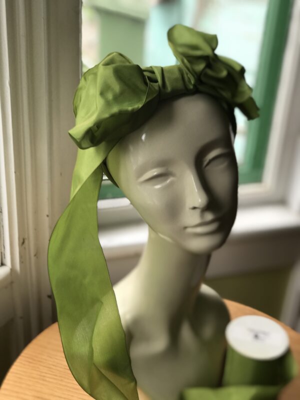 This beautiful ribbon was produced my Midori Ribbon and was made in France. It is 5 glorious inches wide and is sold by the yard. It has the most wonderful metallic sheen and makes a fabulous hat band and oversized bow. It can be used to adorn flower bouquets for weddings or for embellishing garments. Midori ribbon still sells a very limited colour selection of this kind of ribbon. They retail for $21 usd/yd. (approx $28 Canadian)