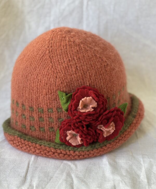This ready to ship Louise hat was naturally dyed with Madder root. It will fit a large through and extra large head size, 23-24.5″.It also comes down quite low, so if you have a short forehead this is not the right hat. Please measure your head before ordering.