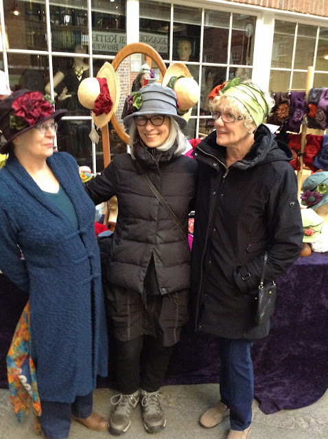 I’m having one of those female highly emotional days. Ya, you know what I mean. I’m just sitting here blubbering and thinking about how much I love my customers. I have also been crying over dog food commercials, but still, the feeling is real. The thing is, sometimes I get these great little pats on the back from some lucky newspaper feature or video and it’s wonderful when it happens and sometimes I run into various brick walls and it’s not so wonderful, but in the end the only thing that matters are these beautiful women of all ages that come and buy my hats. They are the ones that have made me one of the lucky craftspeople that actually gets to do this for a living. They are women from all walks of life and they all have stories and I love to hear them. Oh, good lord, I’m blubbering again. I’ll get on with it. These three ladies didn’t actually know each other, but you see the kind of love that hats inspire. Pictured here are Randi on the left (professor extraordinaire), Ruthie on the right and Judy in the middle.