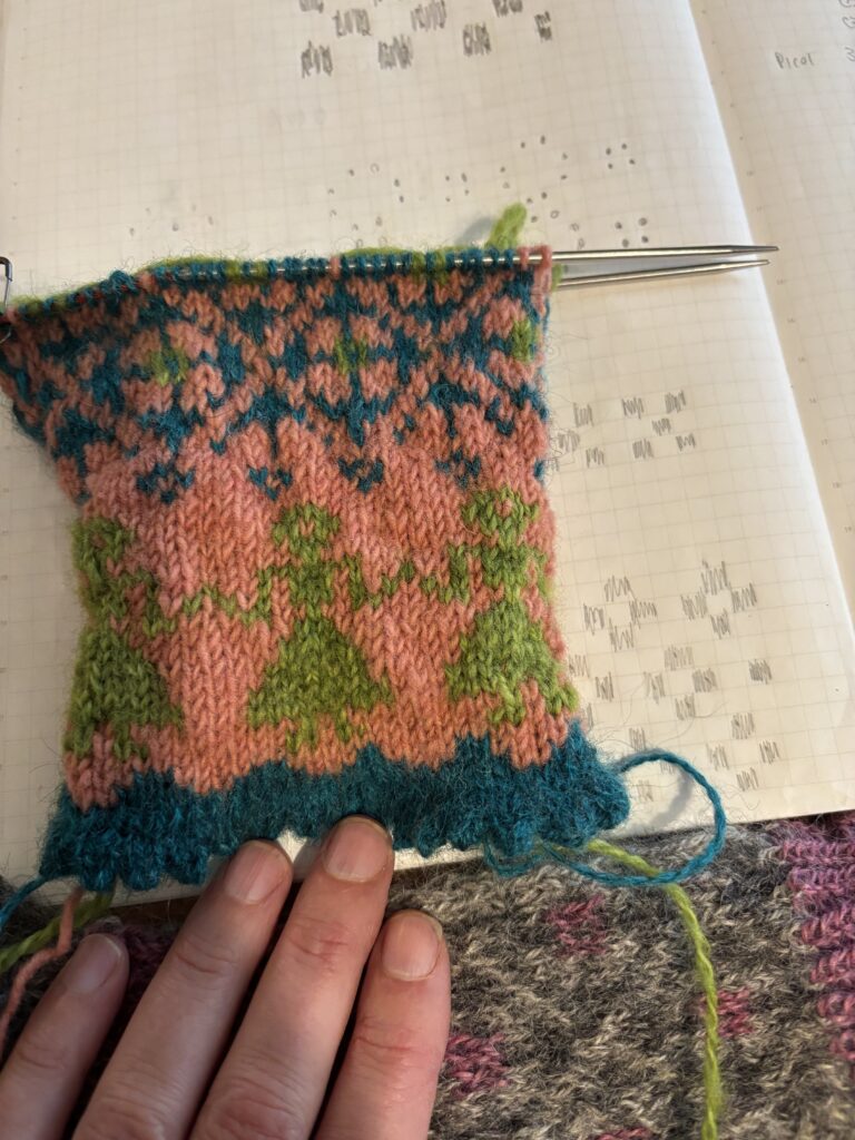 Once the pattern was tech edited for errors, I put out a call for test knitters. This pair was knit by Rose. I love how she combined, Suri Alpaca with wool. It’s really very exciting for me to see other people knit my designs. So many possible colour combinations.