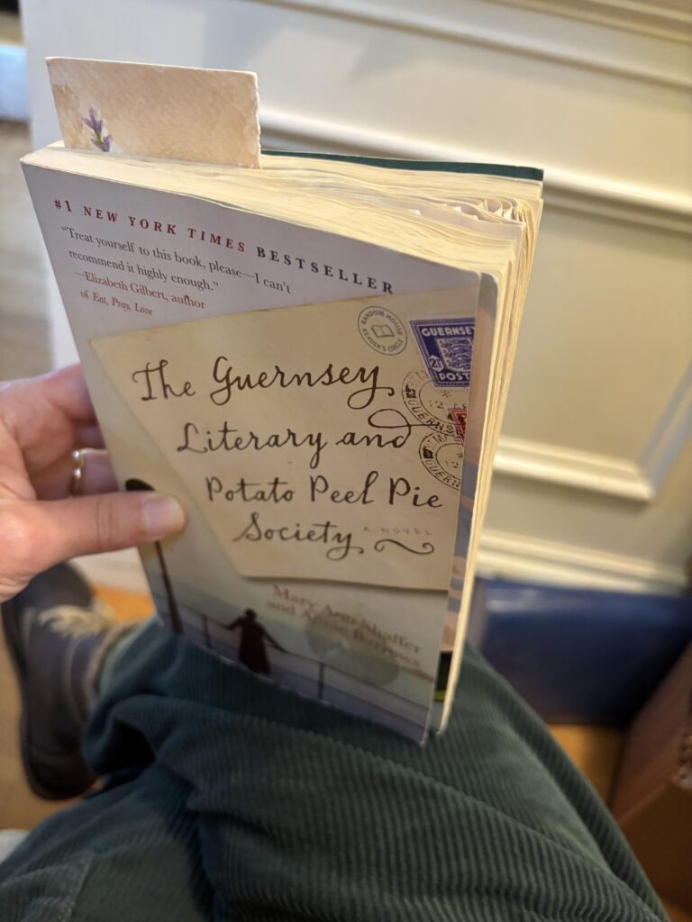 The Guernsey Literary and Potato Peel Society! Oh my, I love this book. My first copy got left accidentally in a seat pocket on a flight from Scotland to Canada. Second copy has been read again and is safely tucked onto a bookshelf in our home. I only hope my forgotten book brings as much joy to the next reader as it did me.